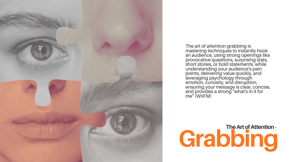 The art of attention-grabbing is mastering techniques to instantly hook an audience, using strong openings like provocative questions, surprising stats, short stories, or bold statements, while understanding your audience's pain points, delivering value quickly, and leveraging psychology through emotion, curiosity, and disruption, ensuring your message is clear, concise, and provides a strong "what's in it for me" (WIIFM).